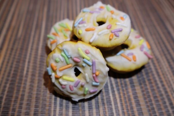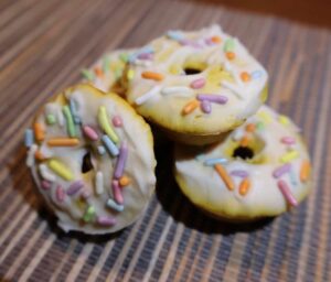 Doggie Donuts (Ingredients: Pumpkin Puree, Peanut Butter, Cinnamon, Unsweetened Applesauce, All-purpose flour, with vanilla yogurt frosting & organic, dye-free sprinkles) Each bag will consist of 12 treats. These are dehydrated for 4 hours and will last approximately 4-6 weeks from the date that they are made. If you want to extend their best by date, place them in the fridge or freezer to last an additional 2 weeks.