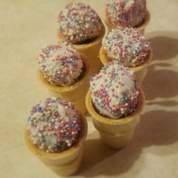 Frosted Pupcakes: Ingredients-Pumpkin Puree, All-purpose flour, Peanut Butter, Unsweetened Applesauce, Cinnamon, topped with vanilla yogurt chip frosting & organic, dye-less nonpariels on top and placed in a mini size ice cream cone. My mom used to make cupcakes in ice cream cones when I was little for my sister and I to bring to school on our birthdays…they were always a huge hit! I decided to make smaller versions of those treats for dogs. Although, they may not look like the traditional cupcake, I call them this because of the treats my mom used to bake for us. 🙂